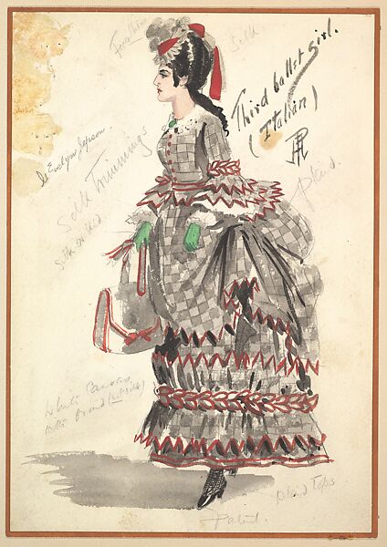 Design for the costume for 'Third Ballet Girl (Italian)' for the play 'Captain Jinks of the Horse Marines'. 'Third Ballet Girl' is displayed in profile view facing left. She is wearing a grey silk and plaid dress combined with red and white silk trimmings. She wears a tight bodice and a Victorian bouffant skirt. She holds a white purse with red trimmings and wears green gloves.