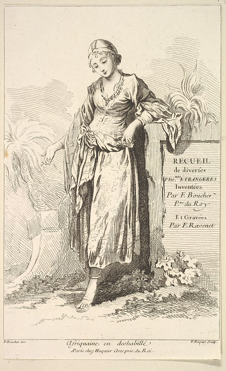 - Title: Afriquaine en deshabillé, plate 1 from "Recueil de diverses fig.res étrangeres Inventées par F. Boucher P.tre du Roy et Gravées par F. Ravenet" (Collection of Various Foreign Figures, Devised by F. Boucher, Painter of the King and Engraved [etched] by F. Ravenet)