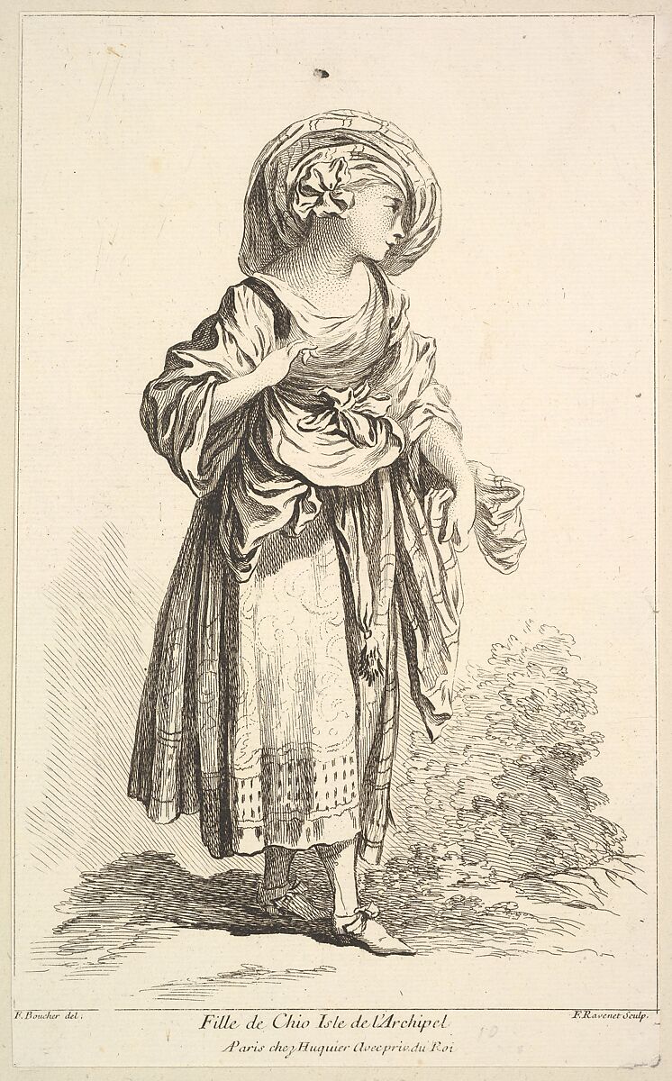 - Title: Fille de Cio isle de l'Archipel, plate 10 from "Recueil de diverses fig.res étrangeres Inventées par F. Boucher P.tre du Roy et Gravées par F. Ravenet" (Collection of Various Foreign Figures, Devised by F. Boucher, Painter of the King and Engraved [etched] by F. Ravenet)