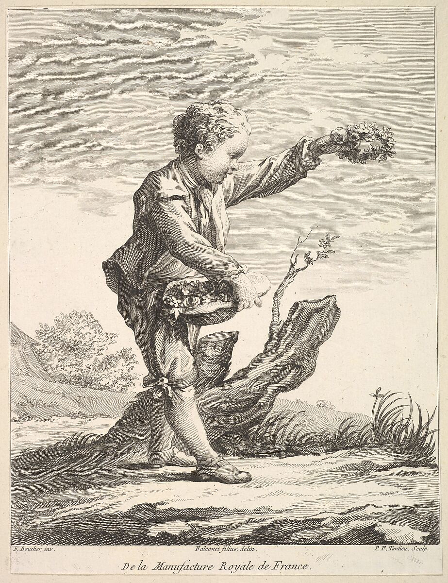 - Title: Little boy holding a wreath and basket of flowers, from "Deuxième Livre de Figures d'après les porcelaines de la Manufacture Royale de France" (Second Book of Figures after porcelains from the Manufacture Royale de France)