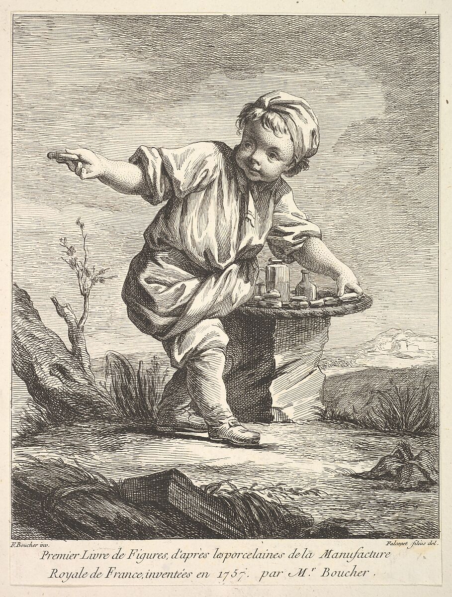 - Title: Frontispiece with litte boy holding a basket, from "Premier Livre de Figures d'après les porcelaines de la Manufacture Royale de France, inventées en 1757, par Mr. Boucher" (First Book of Figures after porcelains from the Manufacture Royale de France, devised in 1757, by Mr. Boucher)