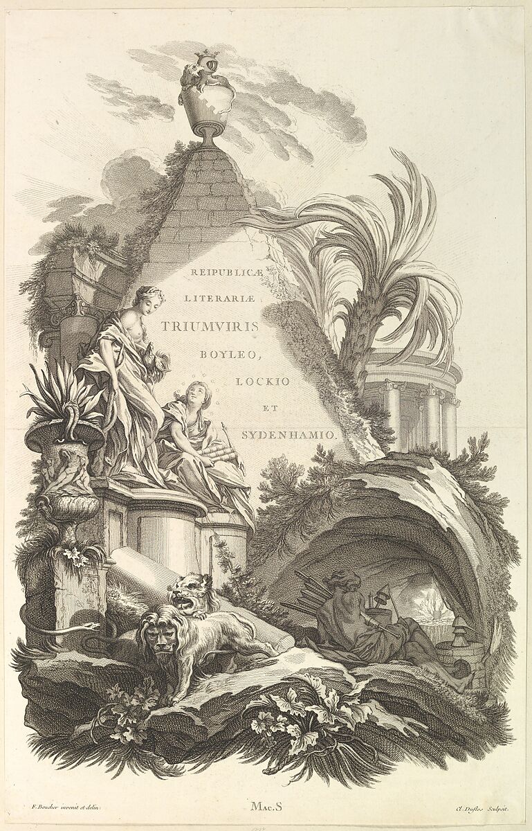 - Title: Frontispice pour le "Tombeau de Boyle, Locke, et Sydenham" (Frontispiece for the "Tomb of Boyle, Locke, and Sydenham"), from Tombeaux des Princes, des Grands Capitaines et autres Hommes illustres (Tombs of Princes, Great Captains, and other Illustrious Men)