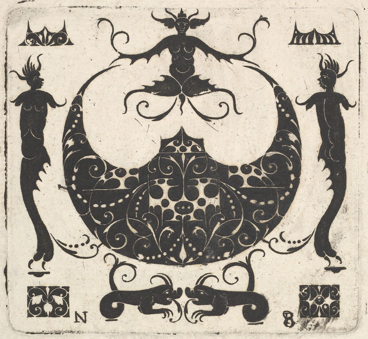 Although this is a very small print, it has been very finely cut by the artist Noël Rouillard. He was the son of a goldsmith, but it is unclear whether he ever actually worked as a goldsmith himself. He did however publish several print series with designs related to this profession. This print comes from a series of twelve such prints and shows a design for a lunar-shaped ring bezel in its center. Rouillard combined this design with several other motifs such as the fantastical creatures depicted on all four sides of the central motif.