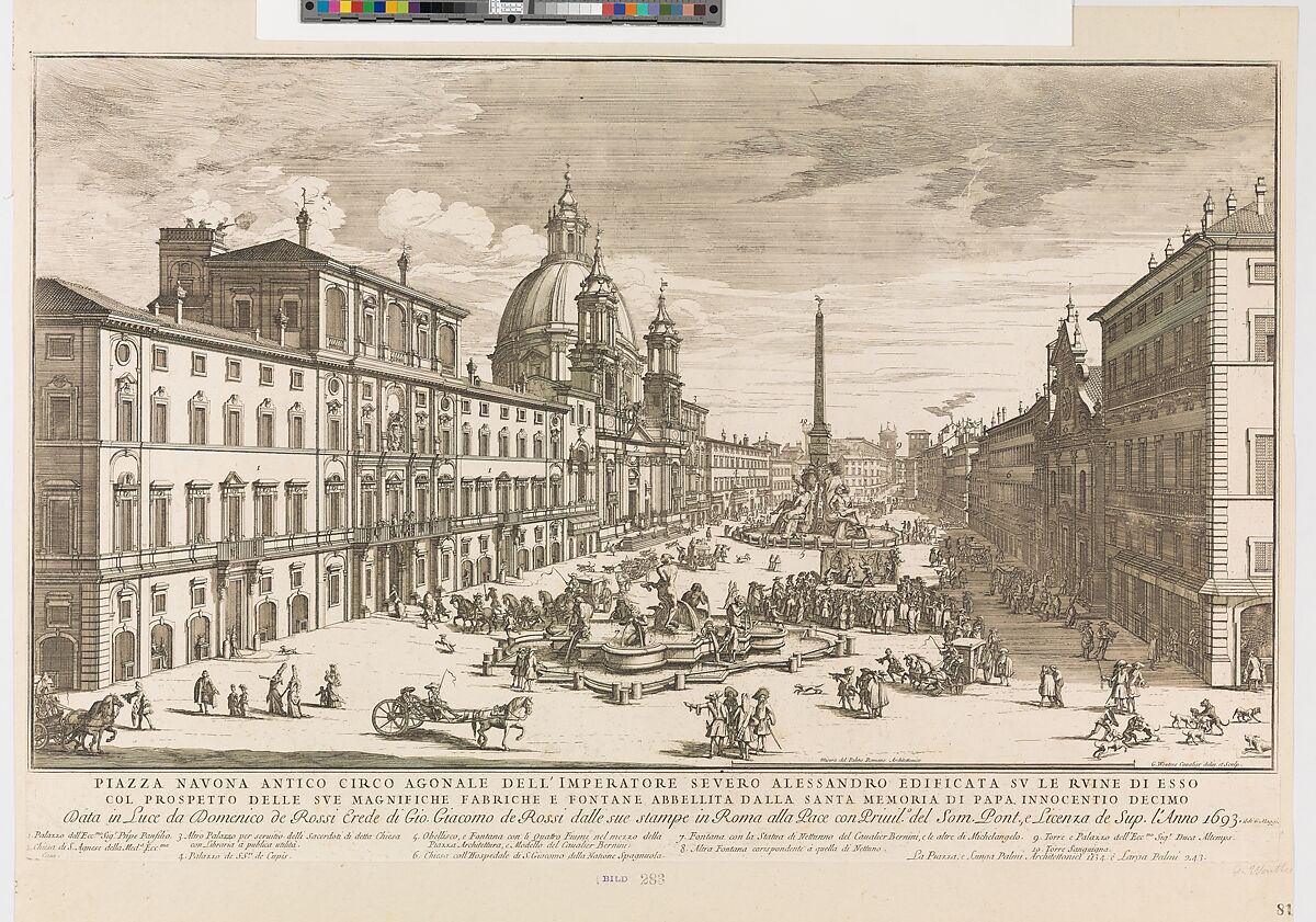 - Title: View of the Piazza Navona, Rome, with the church of St Agnese at left and Bernini's fountain in the middle