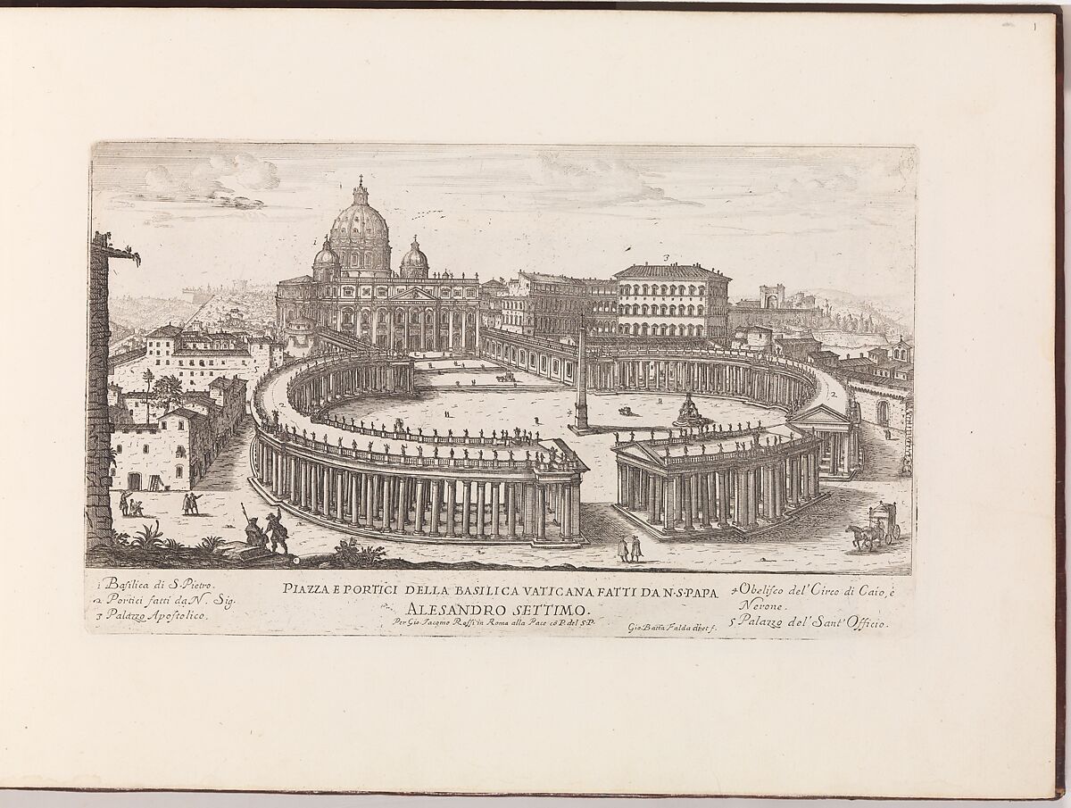 Bird's-eye view of the square and arcade in front of Saint Peter's Basilica in Rome. The arcade is depicted in a stage of the plans that was never realized with a third part of the arcade on the far side, leaving only two narrow entrances to the square. Numbers are added near several notable buildings and monuments which are identified below the image.