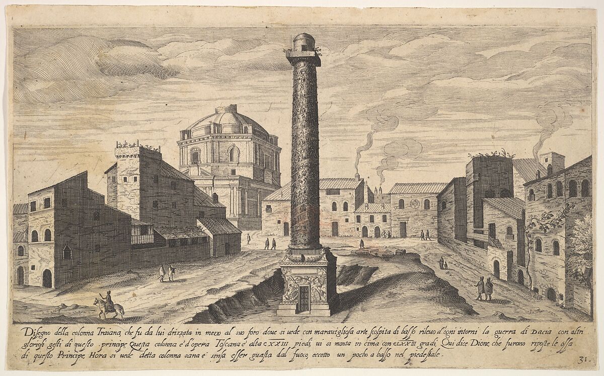 - Title: View of the column of Trajan, shown with its pedestal dug out from the earth, surrounded by buildings at the base of the Quirinal Hill, Rome, plate 31 from "Ruins of the antiquity of Rome, Tivoli, Pozzuoli, and other places" (Vestigi della antichità di Roma, Tivoli, Pozzvolo et altri luochi)