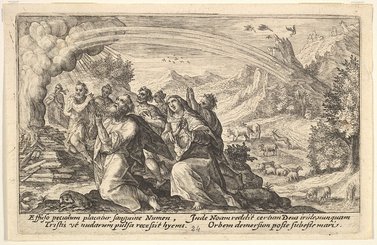- Title: God enters into a covenant with Noah: next to a smoking pyre Noah kneels in a gesture of prayer, surrounded by members of his family, a rainbow stretches over them, from "Liber Genesis"