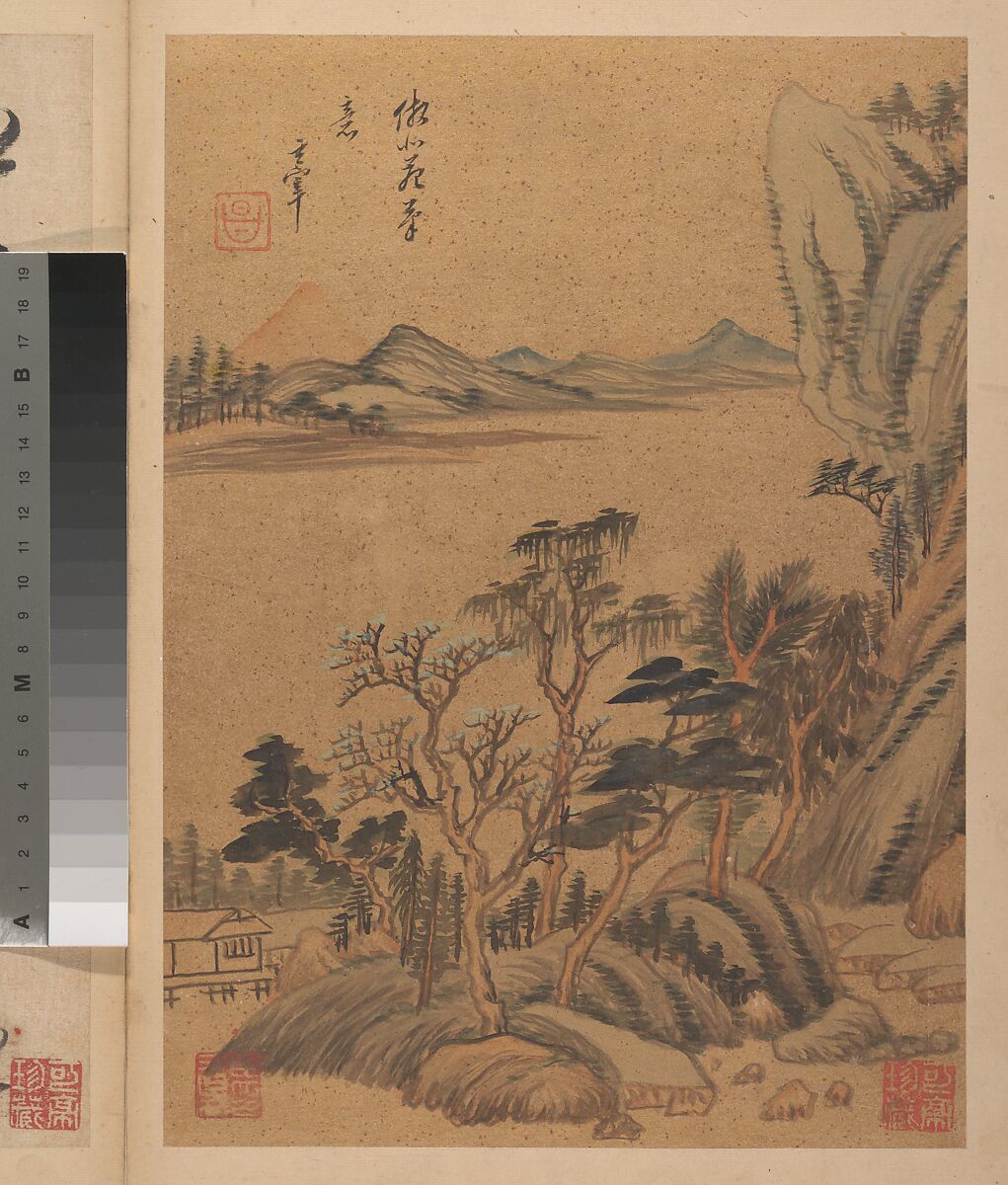 Miffed that his tutor ranked him below his cousin because of inferior calligraphy, Dong Qichang at the age of sixteen dedicated himself to a study of the great calligraphers of the past. By the end of the century, he had become the most influential calligrapher of his age. Although Dong championed the aesthetic of monochromatic ink styles, he indulged in decorative effects in this album, using gold flecked paper with occasional mineral colors for the paintings and choosing a satin ground for his sleek cursive script. Each of the eight leaves, except number seven, is an homage to a past master paired with excerpts from Tang-dynasty landscape poetry. Despite the broad range of styles Dong imitated, the landscapes are remarkably similar to one another and reflect Dong's own intellectual approach to painting most of all.