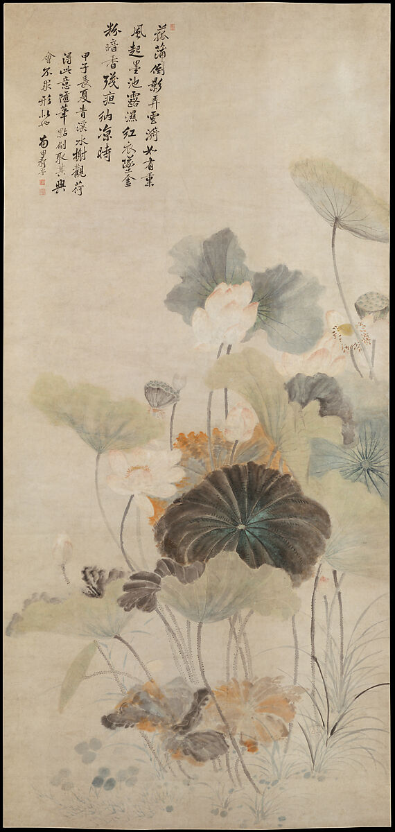 Lotuses, a tour de force of "boneless" (color washes with no ink outlines) painting on paper, shows Yun as the most brilliant and subtle colorist of his time. Although the depiction recalls the realism of Song Painting Academy flower paintings, the artist insists in his colophon that he "merely followed the inclination of [his] brushwork in making dots and washes, benefiting from exhilarating accidents and not searching for physical verisimilitude."