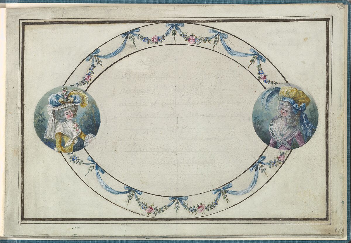 Oval cartouche decorated by a garland of roses and ribbons, with two circular insets featuring a waistlength female portrait type in late eighteenth-century costume with a fichu and a oversized bonnet. ThetTitle inscription, originally done in graphite is partly erased and has become illegible.