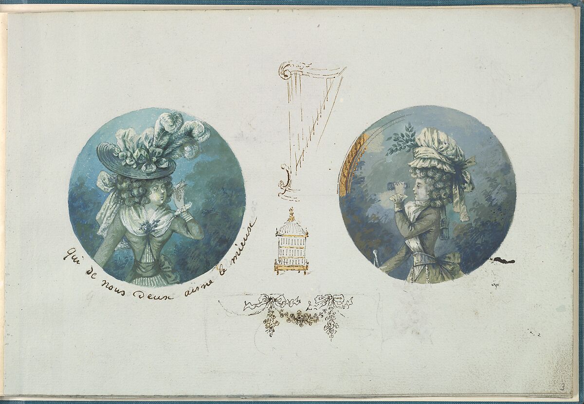 Page with two round portraits in blue and green tones. The left portraits shows a woman in a frontal pose, gazing towards the right and holding a bird in her left hand. She wears a corseted dress and a straw hat with ribbons and feathers. The right portrait shows a woman in profile facing left and holding binoculars in her left hand. She wears a corseted dress and a large bonnet. A gilt frame is indicated on the left side of the portrait. In between the two roundels are sketches of a harp, a bird cage, and a garland containing flowers and ribbons.