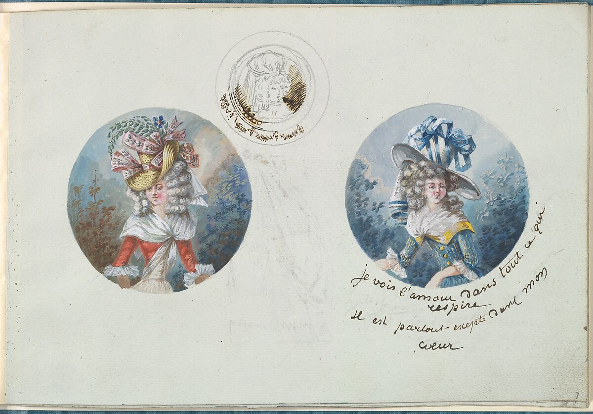 Page with two round portraits in gouache and a third round sketch in graphite and ink. The left portrait shows a woman turned slightly toward the left. She is wearing a red jacket with a fichu and a creme corseted dress. She wears a large straw hat with pink bows, a blue flower, and green leaves. The woman in the portrait on the right turned towards the left, but has turned her had towards the viewer. She wears a corseted, blue and yellow striped dress with yellow trimming and buttons. She has a large white hat with blue stripes and ribbons. The graphite sketch above the two gouache portraits shows a bust of woman who wears an oversized bonnet-style hat. The portrait is framed and part of the frame is decorated by a string of garlands.
