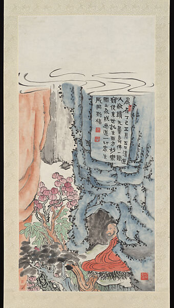 This depiction of the Buddha of Longevity is highly unconventional and provocative. Instead of being shown in his Western Paradise, the Buddha sits alone in a cave, recalling the Chan (Zen) patriarch Bodhidharma meditating before a cliff face and bringing to mind the ideal of the individual pursuit of enlightenment through spiritual striving and physical austerity. Li's strident palette and intentionally naive drawing style may be intended to evoke the primary colors and archaic style found in Buddhist wall paintings of sixth- and seventh-century cave temples at Dunhuang, but his assertive contour lines and dynamic composition have a self-conscious quality that is distinctly modern. Li's inscription on a rock, which recalls the weather-worn monumental writings on cliffs, expresses the desire for release from an existence that, from a political point of view, he finds painful: