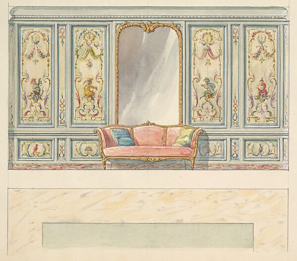 Design for a period style wall elevation with a large mirror and sofa in the middle bay. The mirror is characterized by a double arch. On each side of the mirror there are decorated wall panels showing grotesque designs with singeries in the manner of Antoine Watteau and Francois Boucher. On the bottom of the page part of the floor for the room has also been depicted.