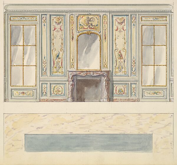 Design for a period style wall elevation. A marble chimney piece is situated in the middle of the wall and is combined with a mirror. The walls surrounding the chimney and mirror are clad with panels, decorated with grotesque designs in the manner of Antoine Watteau and Francois Boucher. The two outer bays of the wall are largely covered in mirrors, seperated from each other by a gilt frame. On the bottom of the page part of the floor for the room has also been depicted.