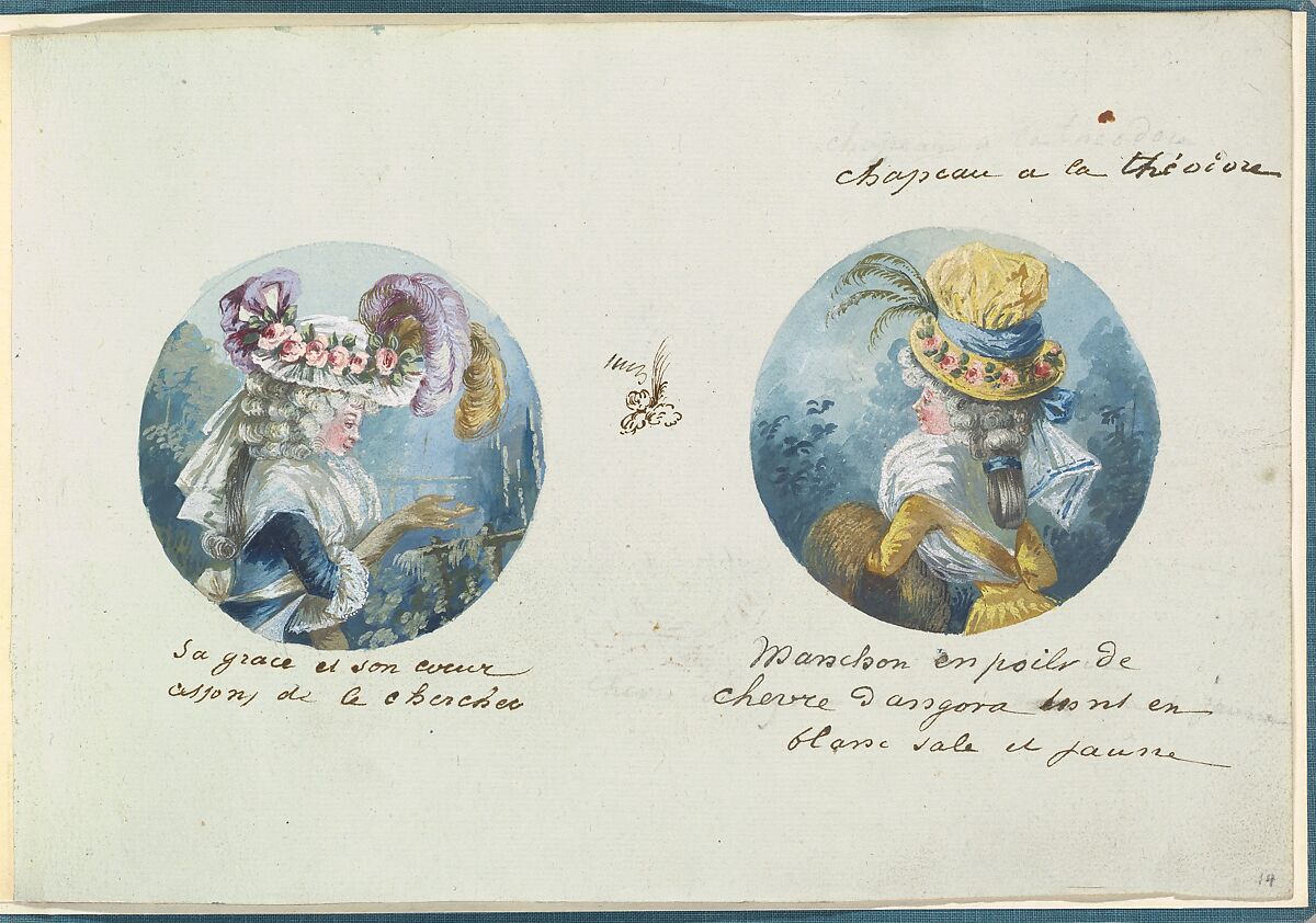 Page with two round portraits. The left portrait depicts a woman in profile facing right. She is wearing a blue corseted bodice with a white fichu and beige/grey gloves. She has a white ruffled hat decorated with pink roses, purple and yellow feathers, and a veil at the back. The portrait on the right is of a woman in profile facing left. She wears a yellow dress with a white fichu. She has a yellow hat with pink roses along the brim, as well as a blue ribbon, and green feathers. She holds a brown fur muff. In between the two roundels is a small ink sketch of flowers and a feather.