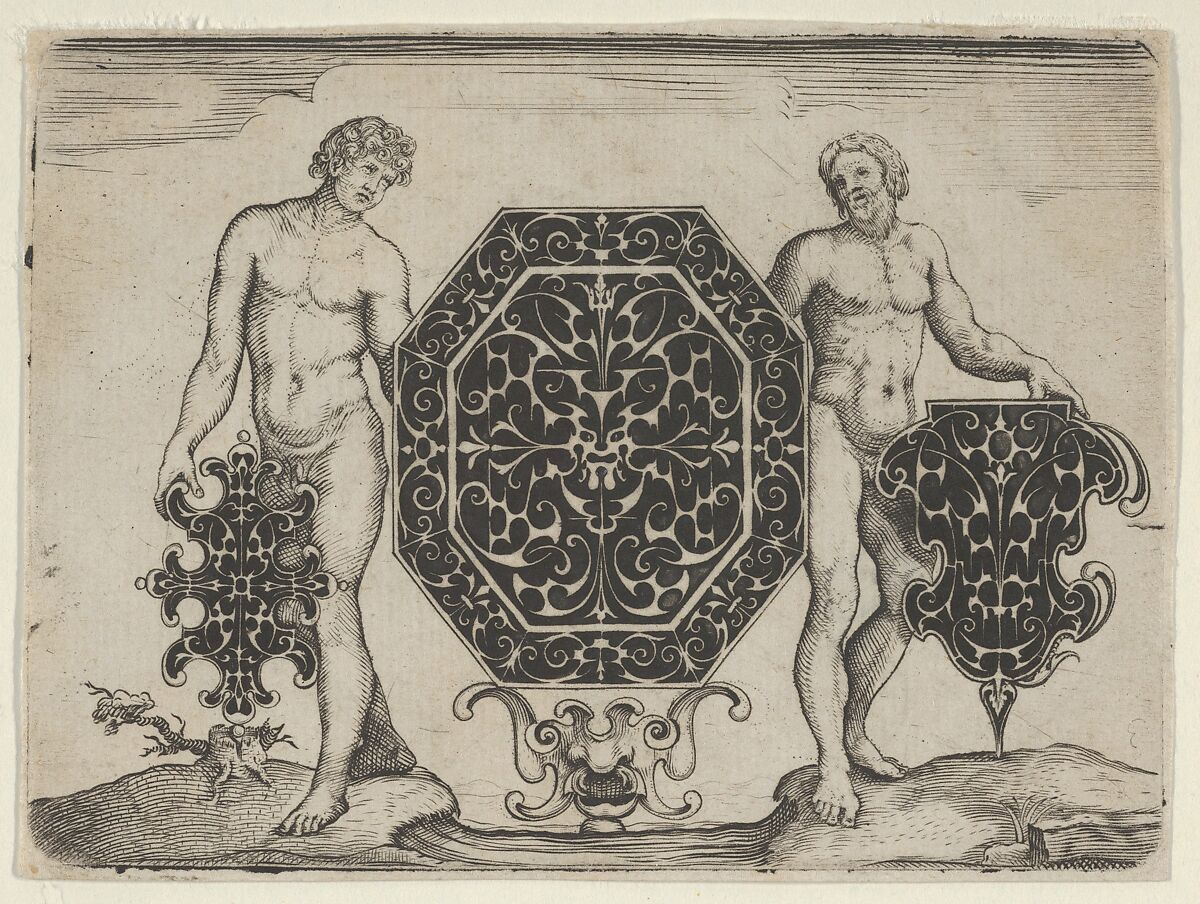 Print from a series of six with goldsmith's designs in blackwork. This print shows three designs for goldsmith's work, placed in a landscape two ignudi. In the center an octagonal design for the decoration of a case or pendant is presented. It is held up upright by two ignudi, who each hold another motif in their other hand. These motifs are shaped like ornamental coats of arms and are decorated with Schweifwerk.