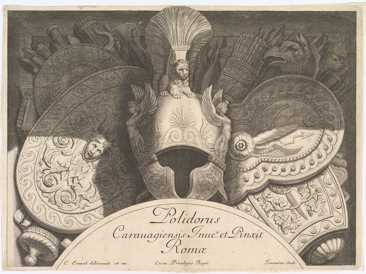 Print from a series of six reproducing the weapon trophies over the second floor windows of Palazzo Milesi in Rome, designed and executed by Polidoro da Caravaggio in 1525/26. The print shows a large trophy with a Roman centurion helmet. The helmet is characterized by two sphinxes and a lion supporting the plume. The helmet is flanked by shields. In a semispherical compartment below the helmet the inscriptions have been placed.