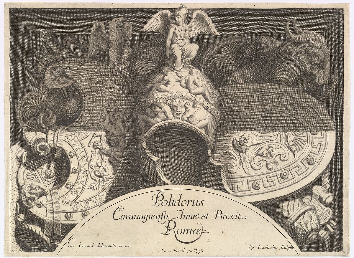 Print from a series of six reproducing the weapon trophies over the second floor windows of Palazzo Milesi in Rome, designed and executed by Polidoro da Caravaggio in 1525/26. The print shows a large trophy with a Roman centurion helmet. The helmet is characterized by a winged female figure, possibly a victory goddess, on top. The helmet is flanked on both sides by a large shield. The shield on the left is an amazon shield. In a semispherical compartment below the helmet the inscriptions have been placed.