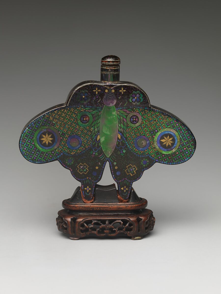 The butterfly is cherished for its beauty and is a common theme, associated with joy and delight, in Chinese art. Fashioning an object such as this snuff bottle into the shape of a butterfly exemplifies the skill and imagination of the designer.