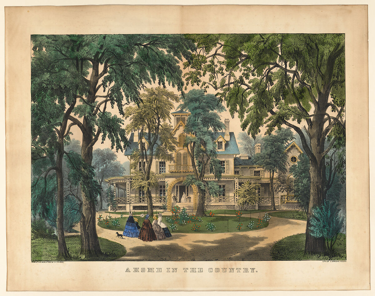 This view centers on a white, three-story Victorian-style country mansion encircled by a porch and seen from a driveway flanked by tall trees. Four women (wearing long dresses), a child, and a dog walk on the path which skirts a circular lawn island accented by two tall trees. At the arched porch entry, a man and woman await their visitors.