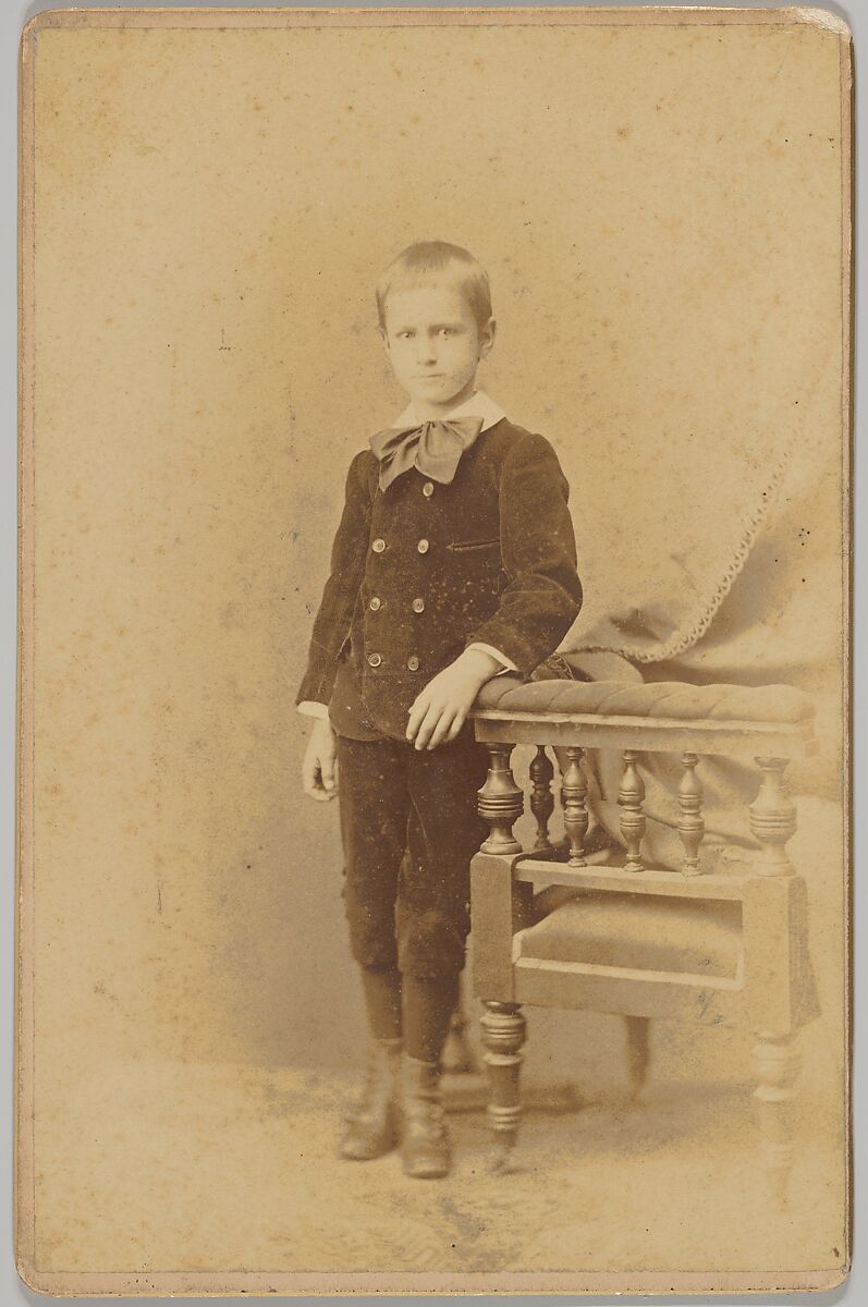 In this boyhood photograph, Maitland Armstrong wears a velvet suit and leans on the arm of a chair. The photographers came from Newburgh, New York, close to the subjects's family home of Danskammer, on the west bank of the Hudson.