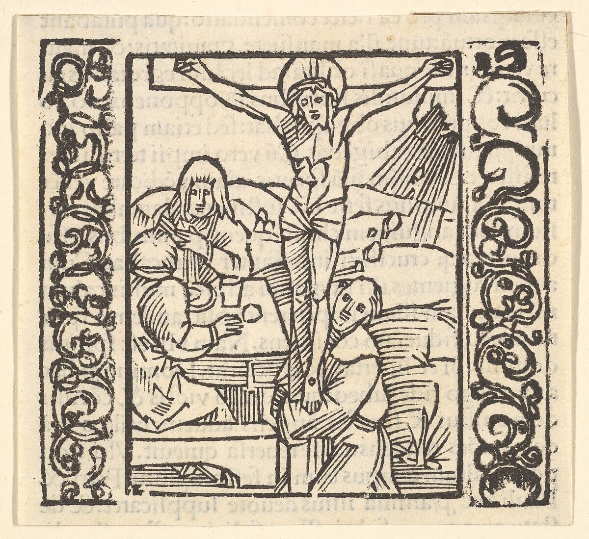 - Title: Crucifixion by a table, illustration from Speculum Passionis, 1507