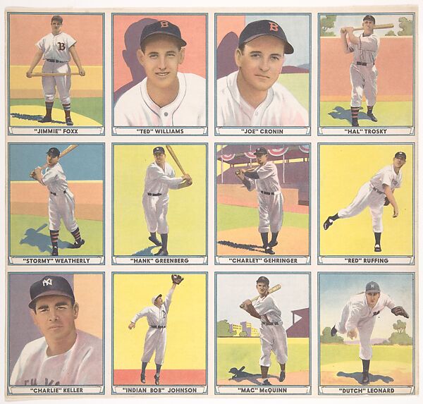 - Title: Uncut Sheet from the Play Ball, Sports Hall of Fame series (R336) including "Jimmie" Foxx, "Ted" Williams, "Joe" Cronin, "Hal" Trosky, "Stormy" Weatherly, "Hank" Greenberg, "Charley" Gehringer, "Red" Ruffing, "Charlie" Keller, "Indian Bob" Johnson, "Mac" McQuinn, "Dutch" Leonard