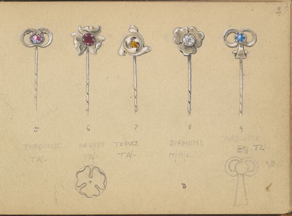 Five designs for a stickpin with a precious stone, all executed in silver. Each pin is numbered (continous from the previous page) and has instructions below related to the stone and the design. The stones are described as: turquoise; garnet; topaz; diamond; turquoise. Two sketches are added at the bottom of the page.