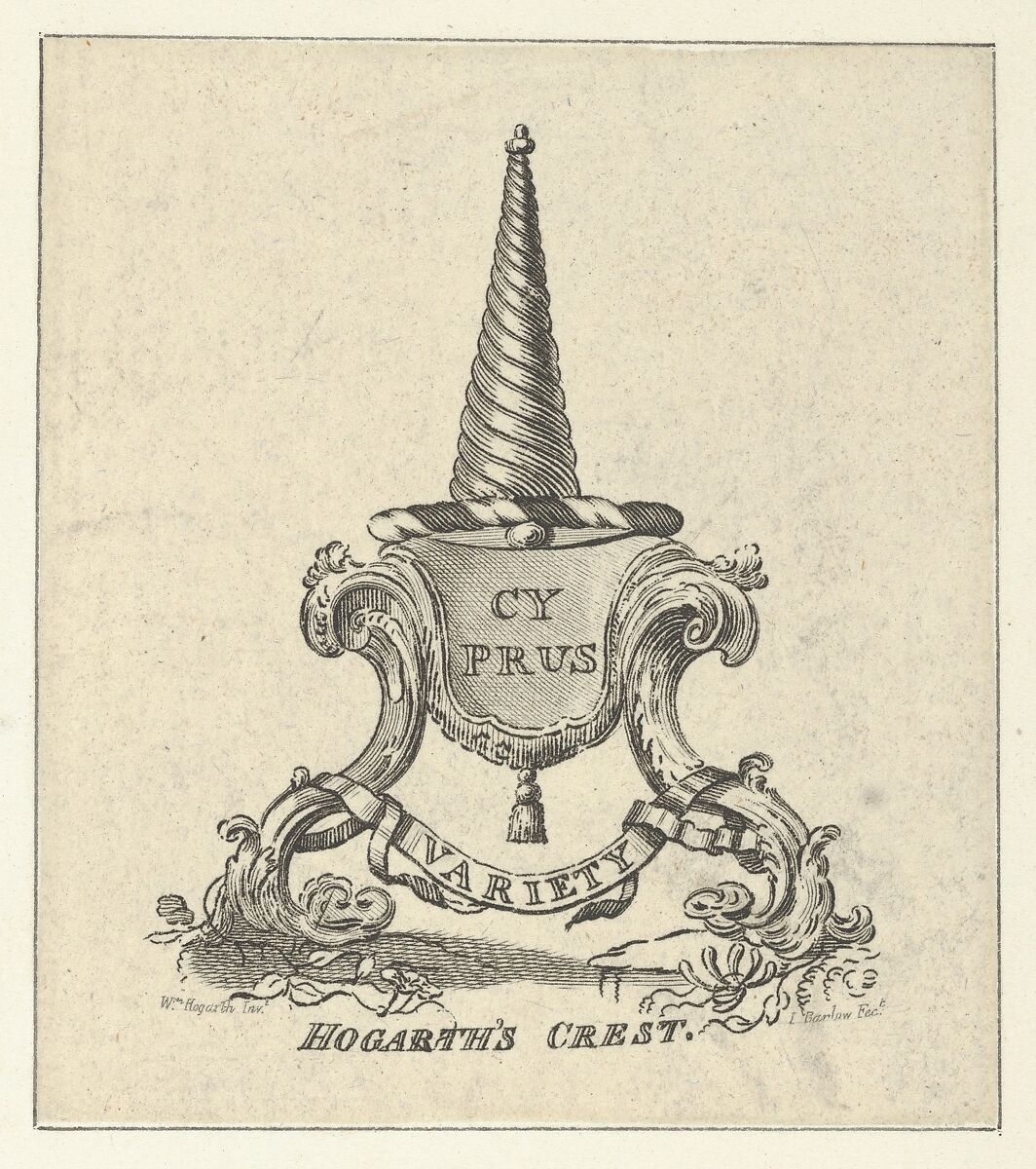 This bookplate, supposedly designed by Hogarth, is inscribed "Cyprus," Variety" and "Hogarth's Crest". A scroll-work design enclosing the word "Cyprus" forms a pedestal to support the "Cyprian cone", the symbolic form under which Venus was worshipped at Paphos. This cone is in the form of a spiral or a pyramidal shell.