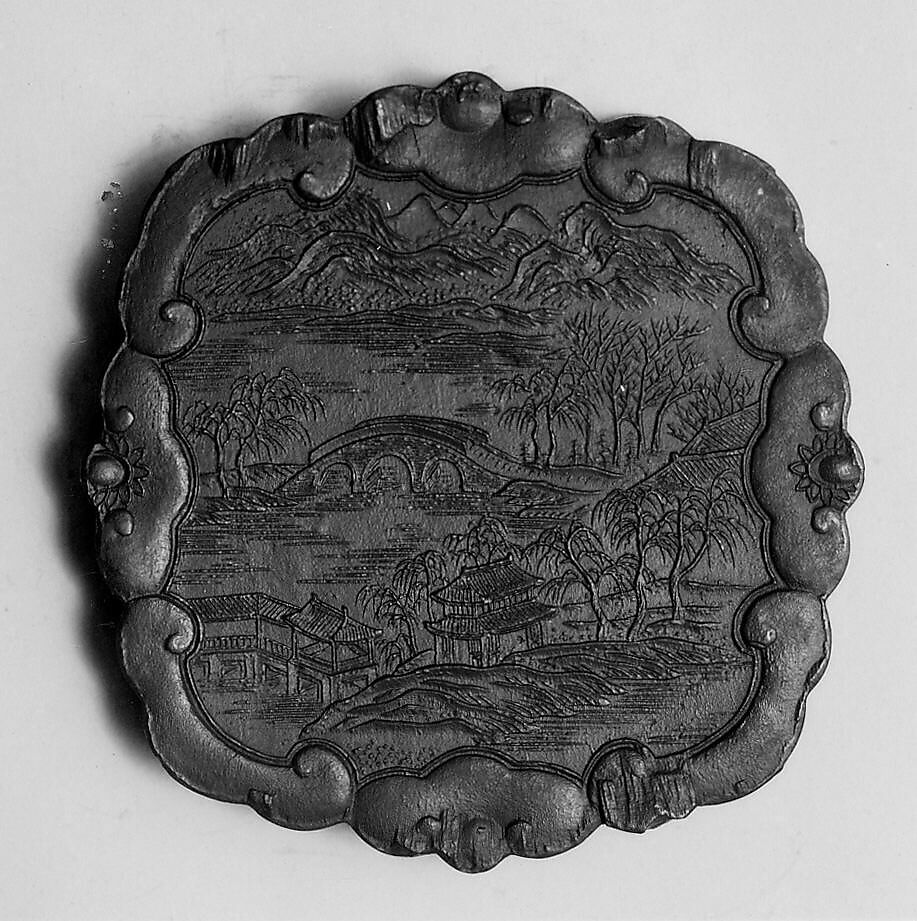 This ink tablet is from a sixty-four-tablet set (30.76.216–.279) commissioned by the Jiaqing emperor from the Studio for Appreciating the Antique (Jiangu Zhai) manufactory of the Wang Jinsheng family in Huizhou, Anhui Province. Each ink tablet commemorates a hall or pavilion in one of the imperial gardens. Each site’s name is written in gilt characters on one side; a view of the site is presented on the other. Such inks were purely decorative and not intended for use.