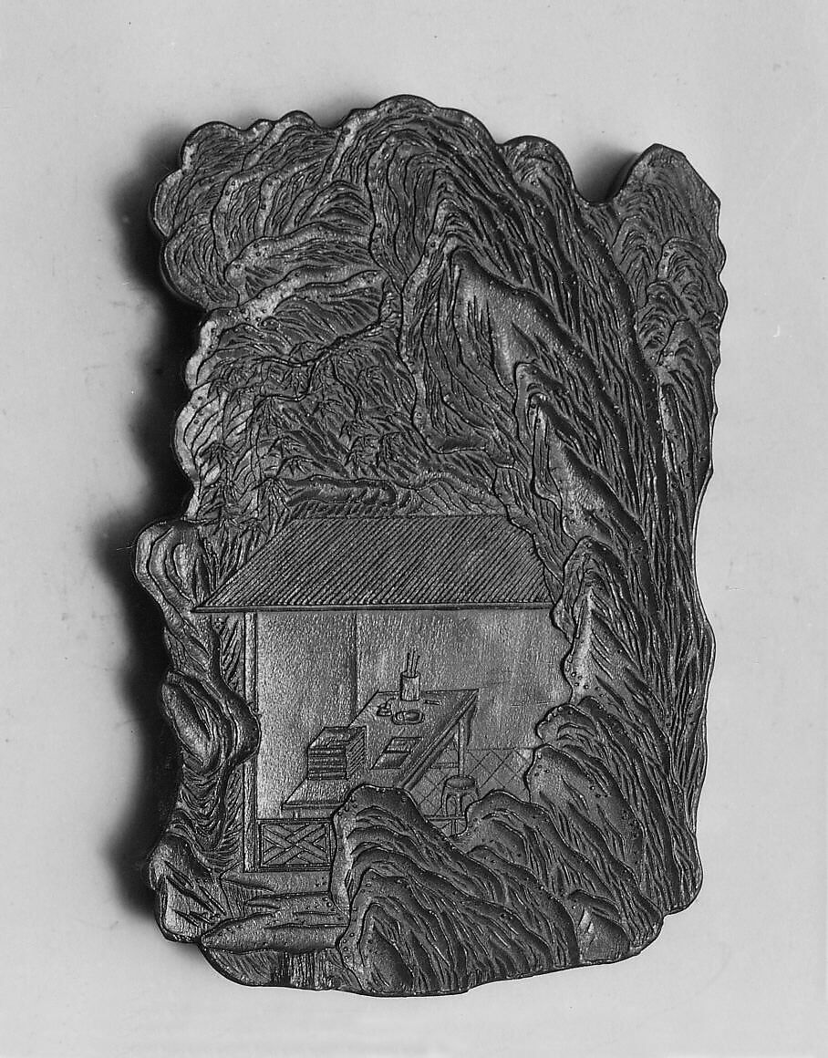 This ink tablet is from a sixty-four-tablet set (30.76.216–.279) commissioned by the Jiaqing emperor from the Studio for Appreciating the Antique (Jiangu Zhai) manufactory of the Wang Jinsheng family in Huizhou, Anhui Province. Each ink tablet commemorates a hall or pavilion in one of the imperial gardens. Each site’s name is written in gilt characters on one side; a view of the site is presented on the other. Such inks were purely decorative and not intended for use.