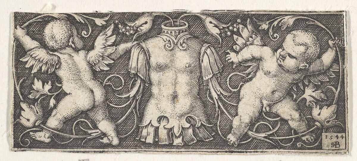 Ornamental frieze with a cuirass at center flanked by two genii or putti. The putti at left is seen from behind and both grab at tendrils growing from the sleeves of the cuirass. Reverse copy after Barthel Beham (Pauli 76).