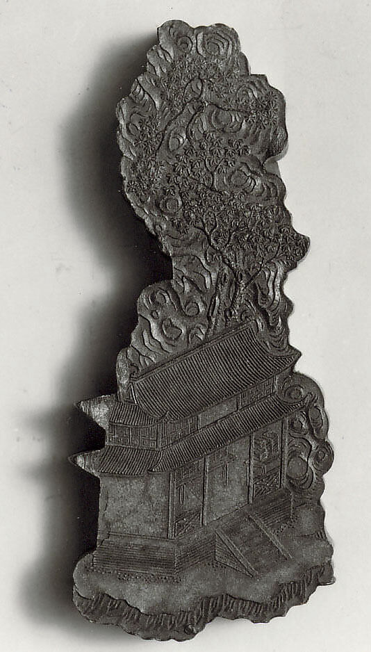 This ink tablet is from a sixty-four-tablet set (30.76.216–.279) commissioned by the Jiaqing emperor from the Studio for Appreciating the Antique (Jiangu Zhai) manufactory of the Wang Jinsheng family in Huizhou, Anhui Province. Each ink tablet commemorates a hall or pavilion in one of the imperial gardens. Each site’s name is written in gilt characters on one side; a view of the site is presented on the other. Such inks were purely decorative and not intended for use.