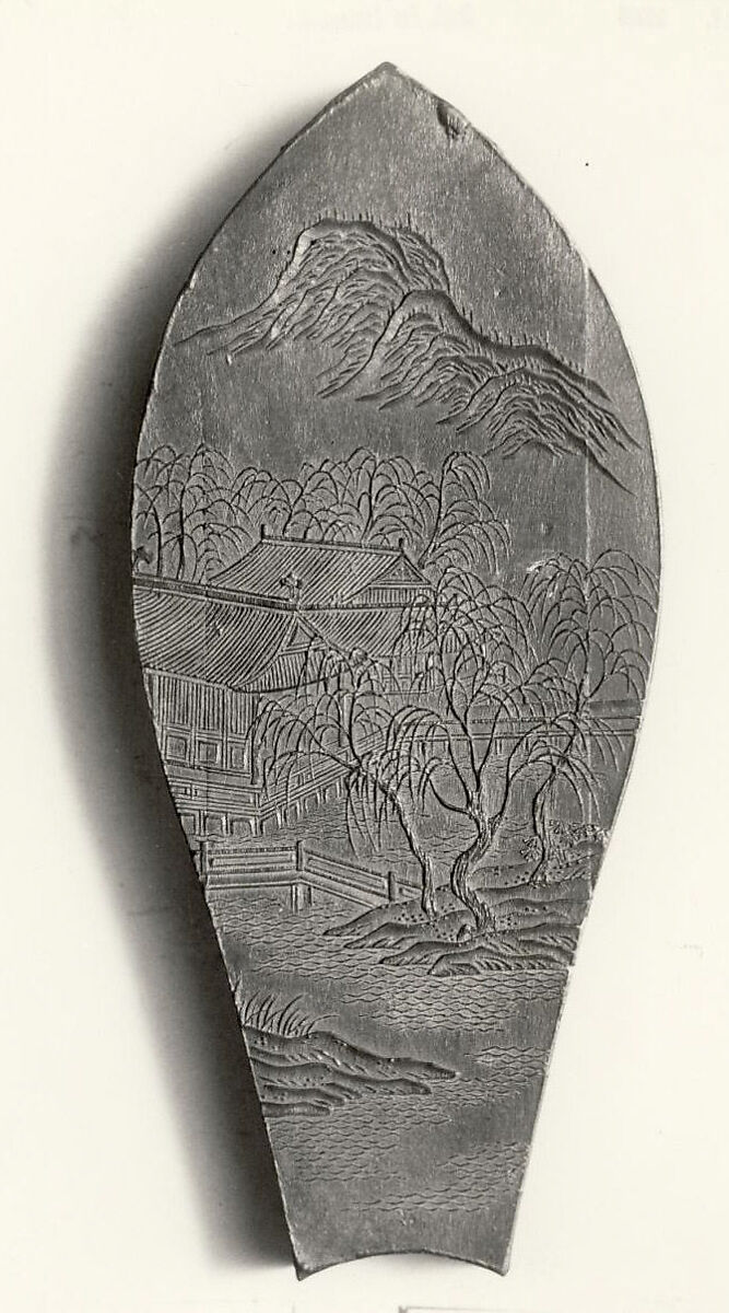This ink tablet is from a sixty-four-tablet set (30.76.216–.279) commissioned by the Jiaqing emperor from the Studio for Appreciating the Antique (Jiangu Zhai) manufactory of the Wang Jinsheng family in Huizhou, Anhui Province. Each ink tablet commemorates a hall or pavilion in one of the imperial gardens. Each site’s name is written in gilt characters on one side; a view of the site is presented on the other. Such inks were purely decorative and not intended for use.