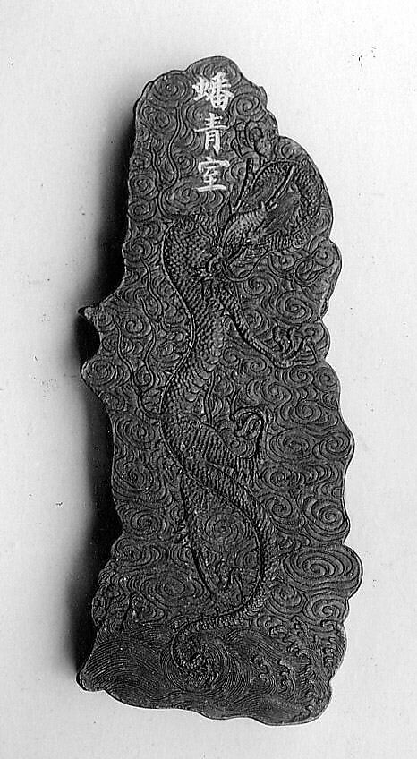 This ink tablet is from a sixty-four-tablet set (30.76.216–.279) commissioned by the Jiaqing emperor from the Studio for Appreciating the Antique (Jiangu Zhai) manufactory of the Wang Jinsheng family in Huizhou, Anhui Province. Each ink tablet commemorates a hall or pavilion in one of the imperial gardens. Each site’s name is written in gilt characters on one side; a view of the site is presented on the other. Such inks were purely decorative and not intended for use.