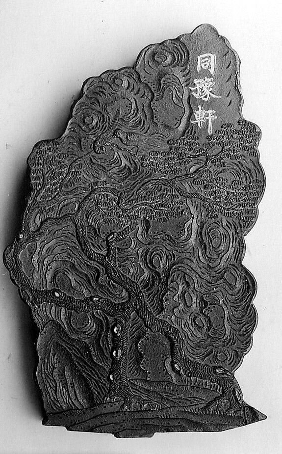 This ink tablet is from a sixty-four-tablet set (30.76.216–.279) commissioned by the Jiaqing emperor from the Studio for Appreciating the Antique (Jiangu Zhai) manufactory of the Wang Jinsheng family in Huizhou, Anhui Province. Each ink tablet commemorates a hall or pavilion in one of the imperial gardens. Each site’s name is written in gilt characters on one side; a view of the site is presented on the other. Such inks were purely decorative and not intended for use.