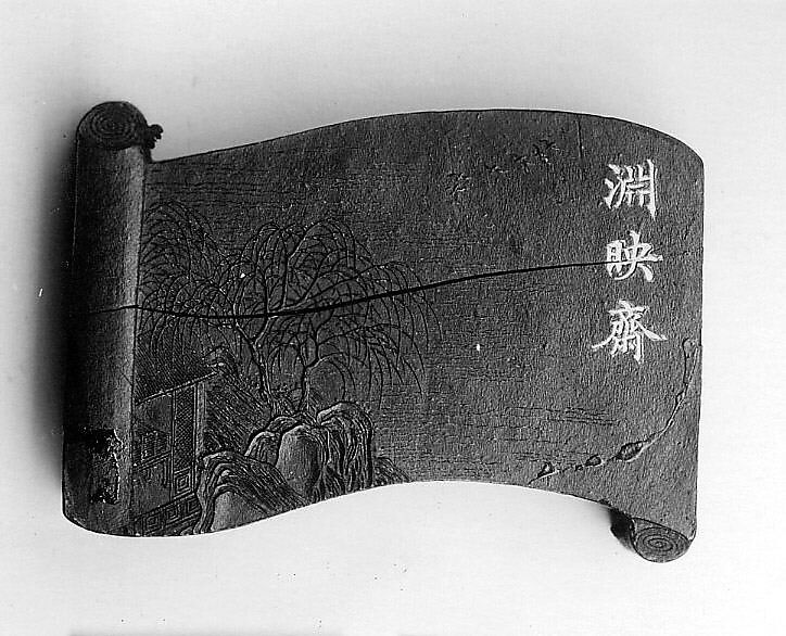 This ink tablet is from a sixty-four-tablet set (30.76.216–.279) commissioned by the Jiaqing emperor from the Studio for Appreciating the Antique (Jiangu Zhai) manufactory of the Wang Jinsheng family in Huizhou, Anhui Province. Each ink tablet commemorates a hall or pavilion in one of the imperial gardens. Each site’s name is written in gilt characters on one side; a view of the site is presented on the other. Such inks were purely decorative and not intended for use.