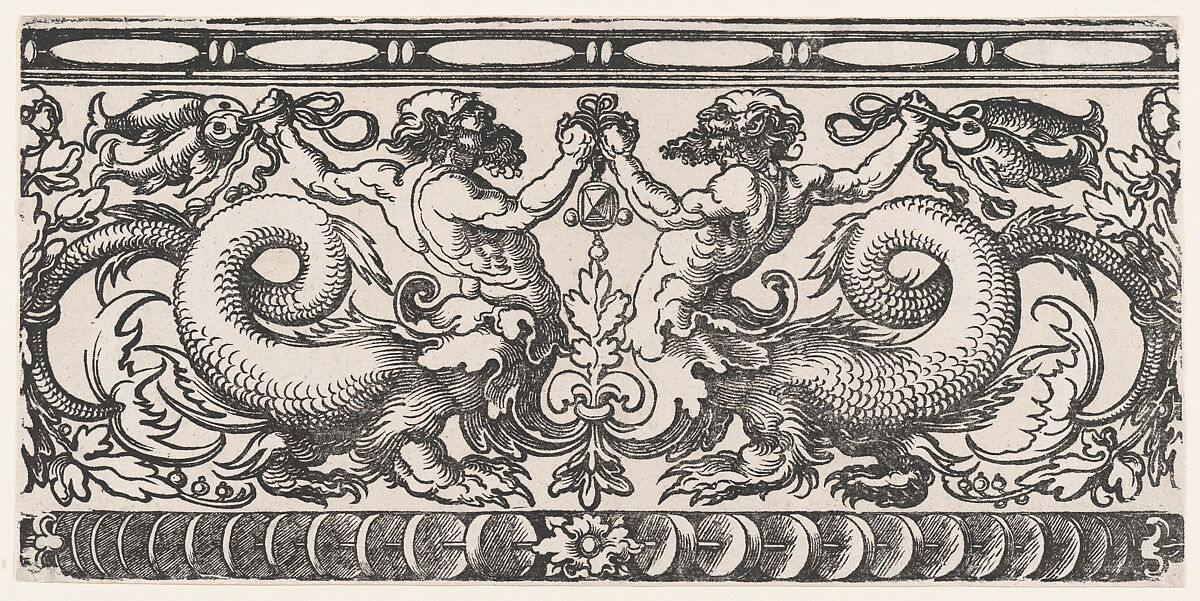 - Title: Symmetric Ornamental Frieze with Two Fighting Hybridic Creatures (Half Satyr, Half Dragon) holding Fish