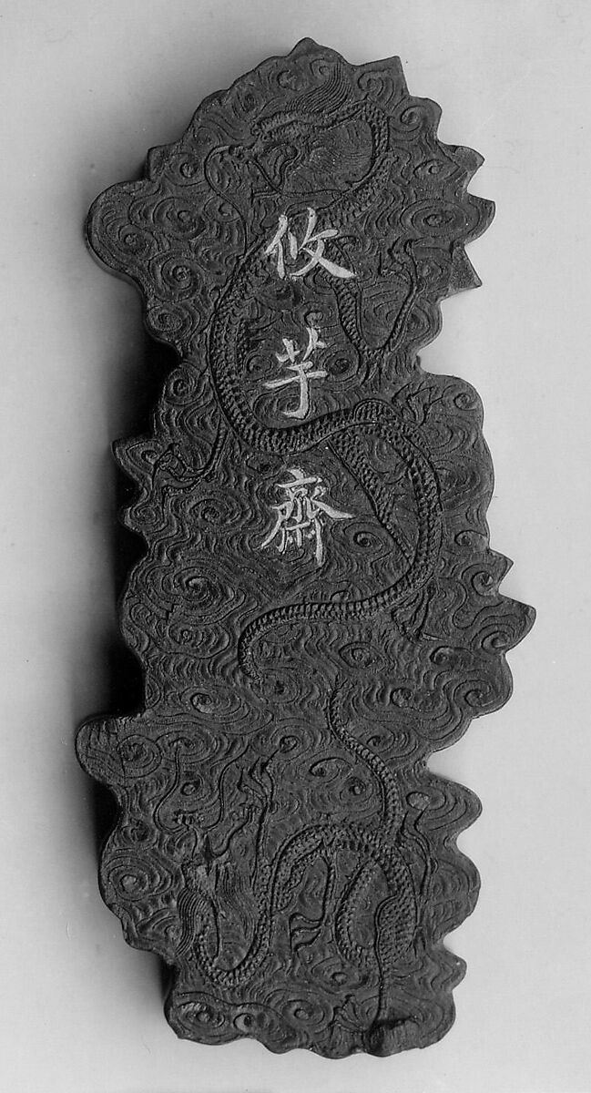 This ink tablet is from a sixty-four-tablet set (30.76.216–.279) commissioned by the Jiaqing emperor from the Studio for Appreciating the Antique (Jiangu Zhai) manufactory of the Wang Jinsheng family in Huizhou, Anhui Province. Each ink tablet commemorates a hall or pavilion in one of the imperial gardens. Each site’s name is written in gilt characters on one side; a view of the site is presented on the other. Such inks were purely decorative and not intended for use.