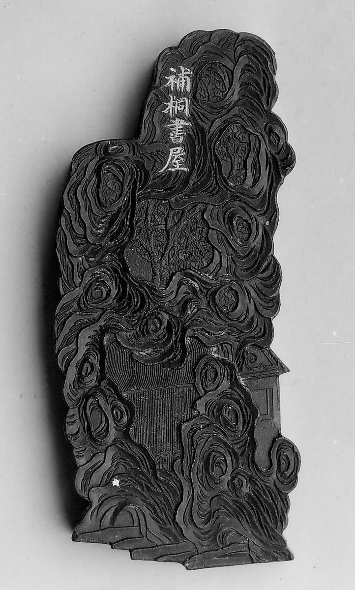 This ink tablet is from a sixty-four-tablet set (30.76.216–.279) commissioned by the Jiaqing emperor from the Studio for Appreciating the Antique (Jiangu Zhai) manufactory of the Wang Jinsheng family in Huizhou, Anhui Province. Each ink tablet commemorates a hall or pavilion in one of the imperial gardens. Each site’s name is written in gilt characters on one side; a view of the site is presented on the other. Such inks were purely decorative and not intended for use.