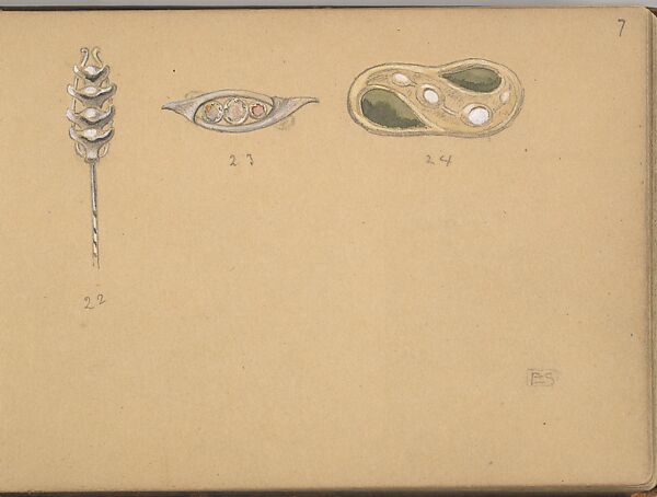 Three designs, one for a stickpin and two ornament designs for a stickpin or a brooch. The three designs are all executed in silver with one or more precious stones. The designs are numbered (continuous from the previous pages).