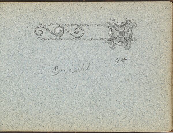 Design for a bracelet with a quatrefoil-shaped ornament on the right. To the left the strap is indicated. It is characterized by its ribbed edges and a meandering running dog motif combined with a pearl.