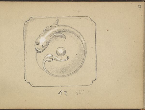Design for a bell push, characterized by a slender fish, encircling the central button, his tail curls inward. The decorative motif is placed on a square plate.