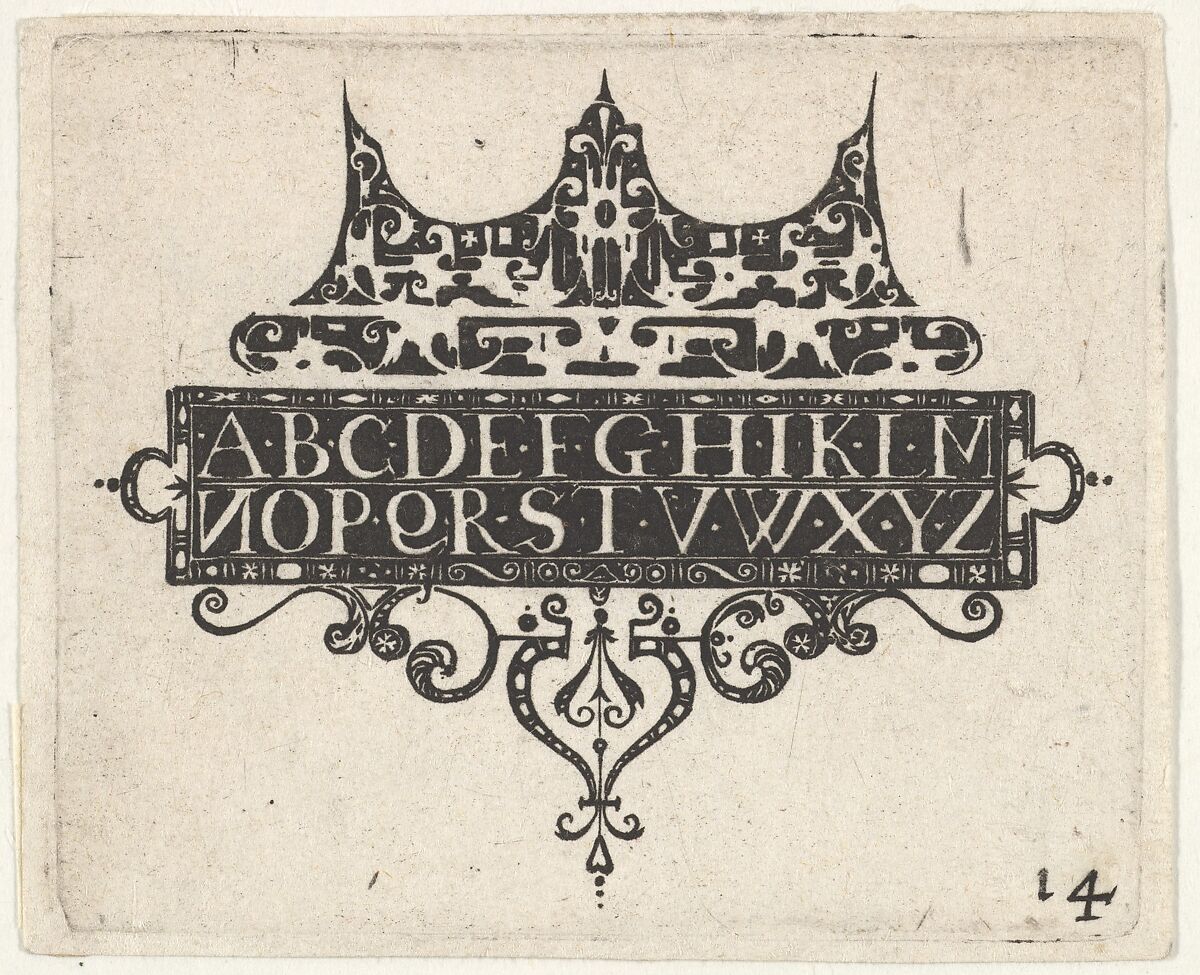 Blackwork print with in the middle a panel on which the alphabet has been depicted. The J and U or V are missing.