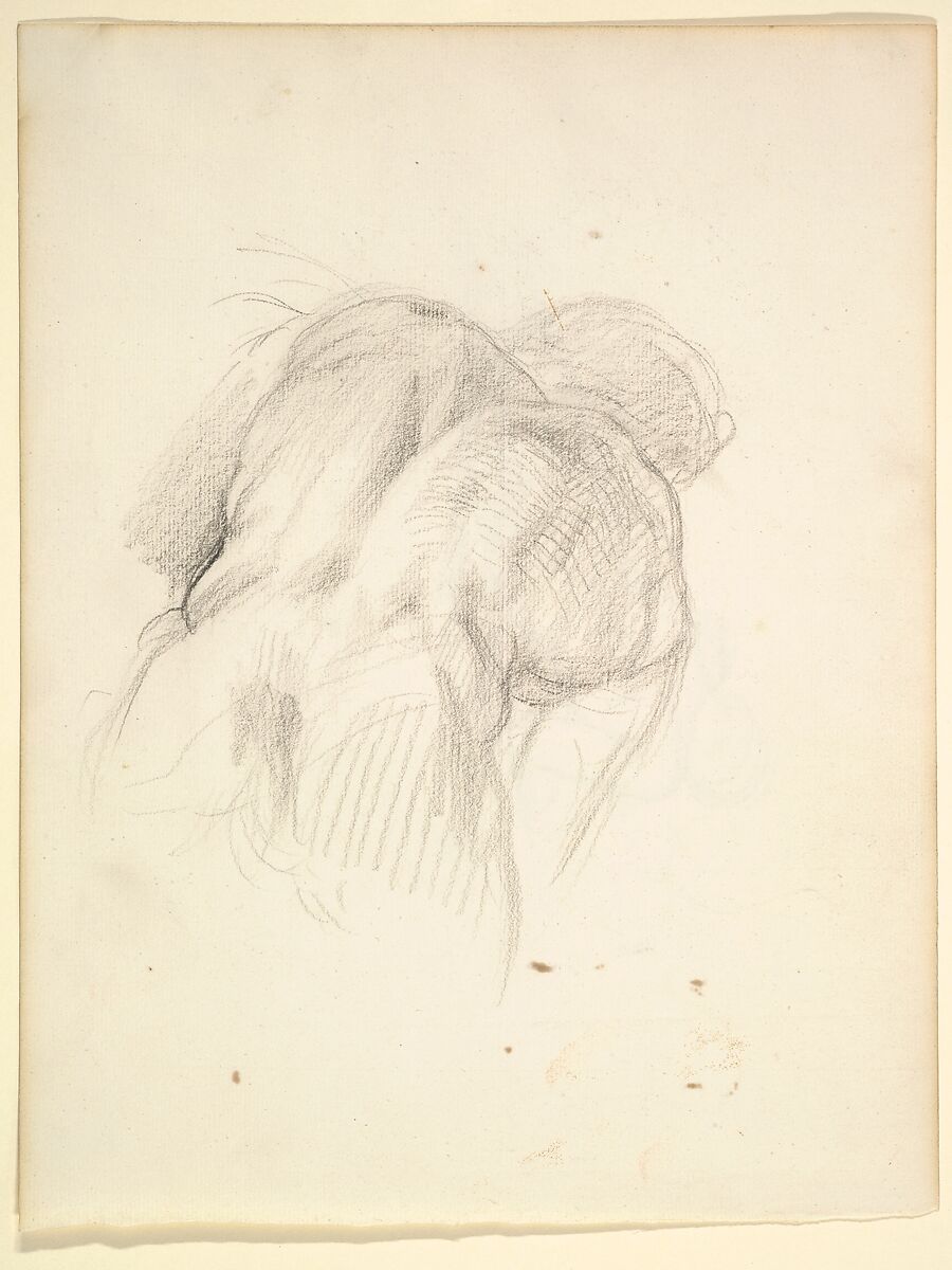 The study of a muscular male nude on the recto of this sheet relates to Richmond’s painting "Comus" exhibited at the Royal Academy in 1864 (now Walker Art Gallery, Liverpool). The story, told in Milton's masque-poem, concerns a girl separated from her brothers in a dark wood who encounters the reveler Comus and his band of followers. A figure based on this drawing appears near the center of the final composition, and Richmond likely based the pose on a figure in Titian’s painting "The Andrians" (Prado, Madrid).