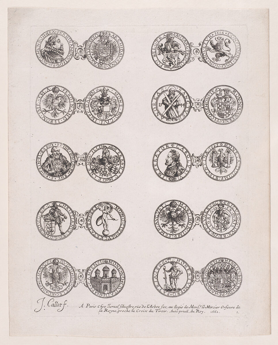 Plate 1, Featuring 10 Coins Issued by European Princes in the 16th and 17th centuries, from "Les Monnaies" (The Currencies)