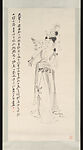 Zhang Daqian's facility as a figure painter, improved by years of studying early scroll paintings and the murals at Dunhuang, is demonstrated in this depiction of the infamous consort of the eighth-century Tang emperor Xuanzong. The portrayal is an eclectic mix of sources and styles. Yang Guifei's elaborate coiffure recalls Tang models; her costume and the animated brushwork that defines her fluttering scarves and swirling hem derive from sixteenth-century prototypes; and her coquettish expression and theatrical pose recall cinematic images of contemporary beauties.
