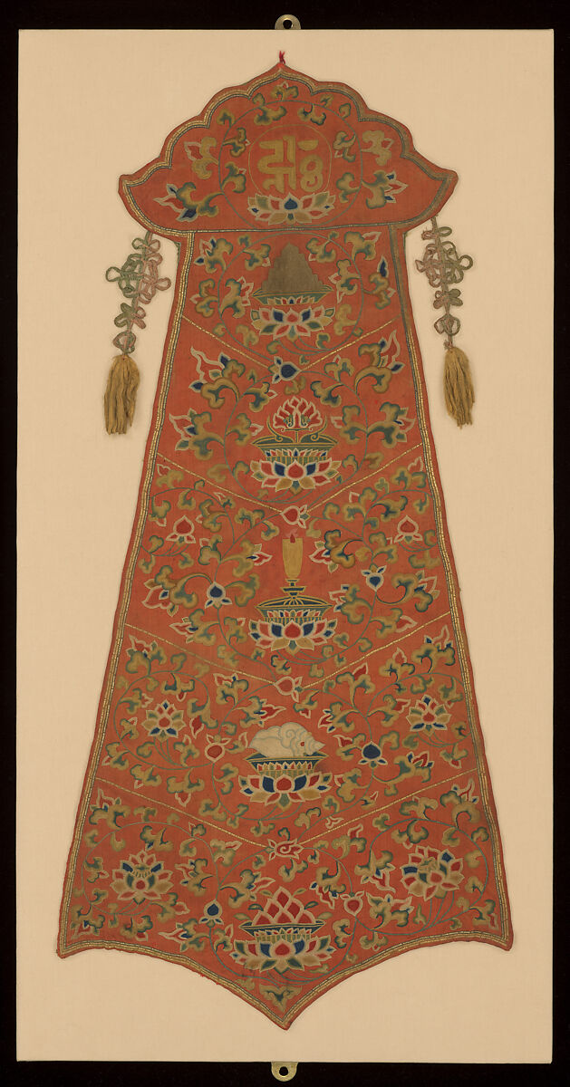 Silk textiles played an important role in the early Ming dynasty, both as the focus of religious practices and as formal gifts to Tibetan Buddhist clerics and other visitors to the Chinese court. This pendant depicts the five auspicious offerings in Buddhism, each symbolizing a sense or perception: the pile of fragrant incense (smell), the flower (color), the candle (light), the conch (sound), and the offering of food (taste). Meticulously embroidered with silk threads, the stylized lotus scrolls demonstrate the standard court design universally used on imperial works of art, including cloisonné enamel wares.