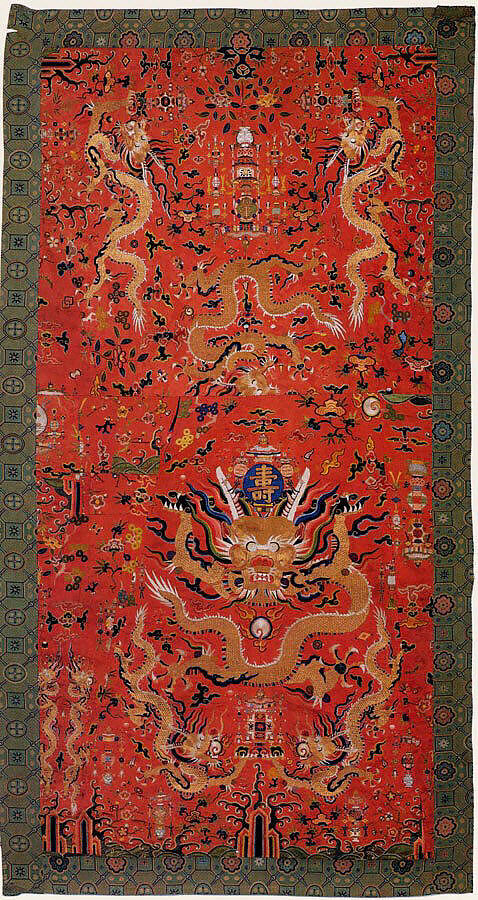 The pieces assembled in this panel are parts of a dragon robe or coat made for the Lantern Festival, which takes place on the fifteenth day of the first lunar month-the first full moon of the year. The panel, which has a wide border of silk woven in the eighteenth century, includes the back and one sleeve of a dragon robe with a pattern of a composite lantern framed on three sides by dragons.